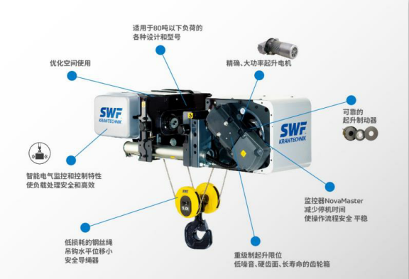 NOVA Silverline是SWF鋼絲繩葫蘆的旗艦產(chǎn)品。此系列產(chǎn)品優(yōu)化使用空間、操作高效、性價比高。NOVA silverline選項多、擴(kuò)展性強(qiáng)、能適合各種工業(yè)應(yīng)用。可根據(jù)不同客戶的需求,配置其功能。