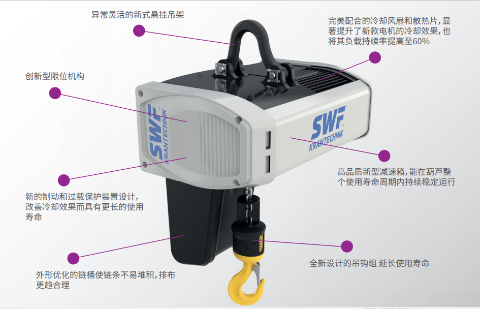 新款起升電機和全新設(shè)計的散熱片提供了更好的冷卻效果,繼而延長使用壽命。 此外,ATHLO系列頗具匠心的限位觸發(fā)機構(gòu)設(shè)計新穎葫蘆 ,使 限位無論是在常規(guī)使用抑或極端條件下均能完美工作。